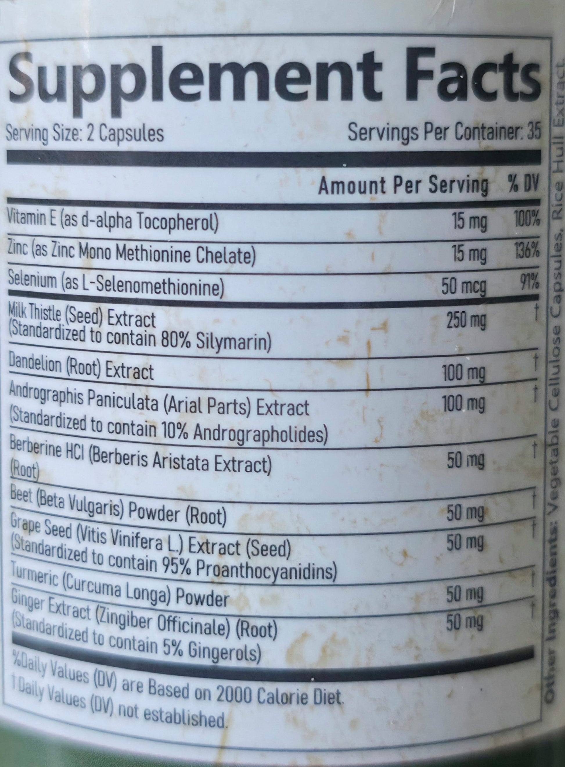 Osim Mlečnog Čička sadrži i Maslačak te jako bitne biljne dodatke poput Kurkume,Berberina,Cvekle,Extrakt semenki groždja,Andrografis Extrakt biljke,Đumbir extract,Vit.E (alfa-tocoferol),Cink i Selen